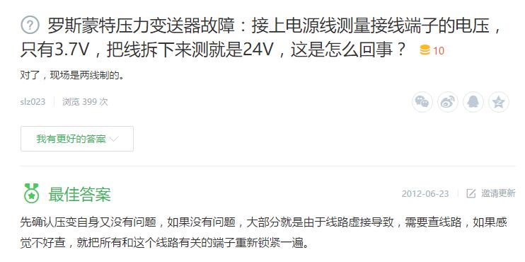 1、羅斯蒙特壓力變送器故障:接上電源線測量接線端子的電壓,只有3.7V,把線拆下來測就是24V,這是怎么回事?(對了,現場是兩線制的。)