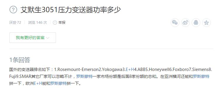國外的變送器排名如下:1.Rosemount-Emerson2.Yokogawa3.E+H4.ABB5.Honeywell6.Foxboro7.Siemens8.Fuji9.SMAR其它廠家可以忽略不計,羅斯蒙特一家市場份額是后面8家份額的總和。在亞洲橫河還能和羅斯蒙特拼一下,歐洲E+H能和羅斯蒙特拼一下。